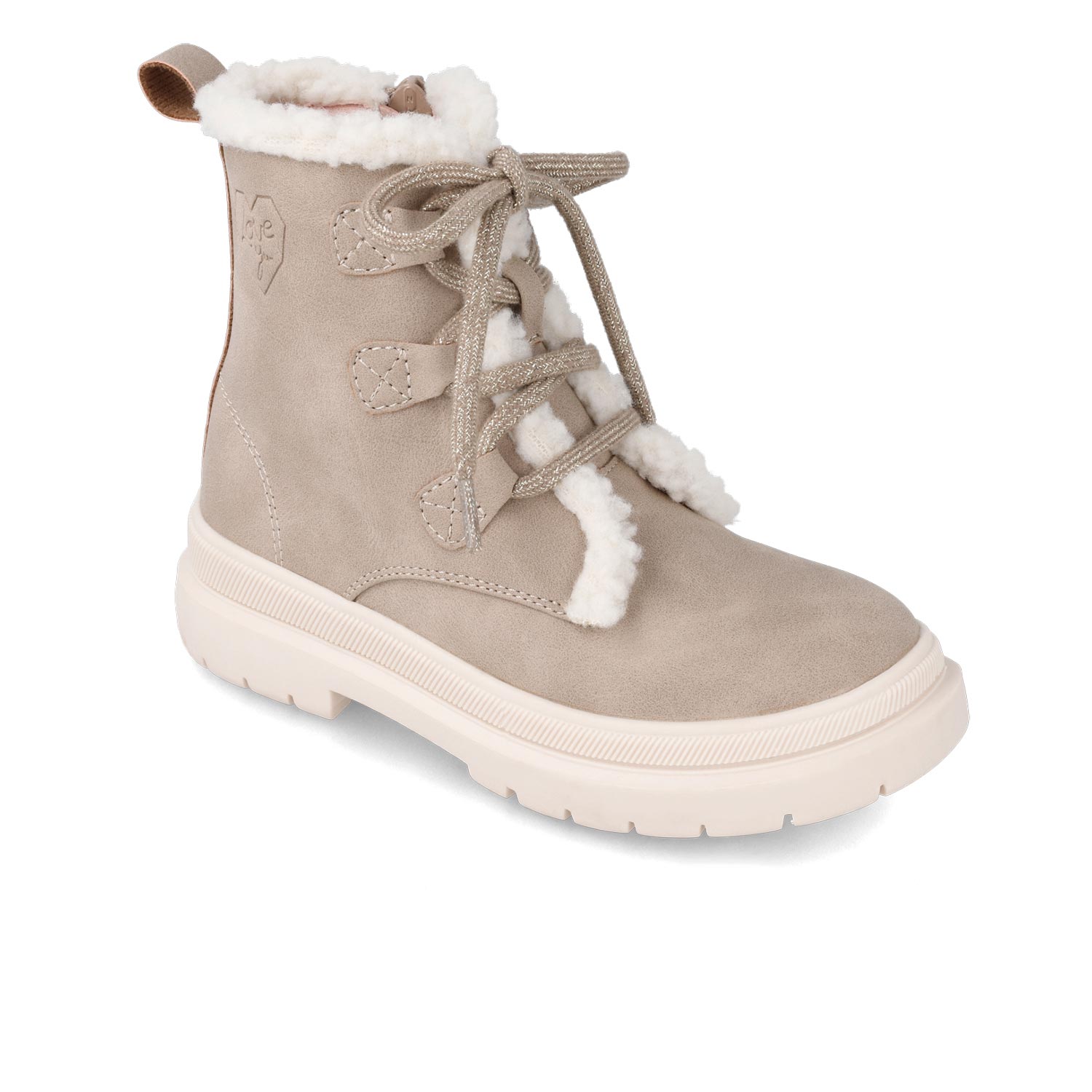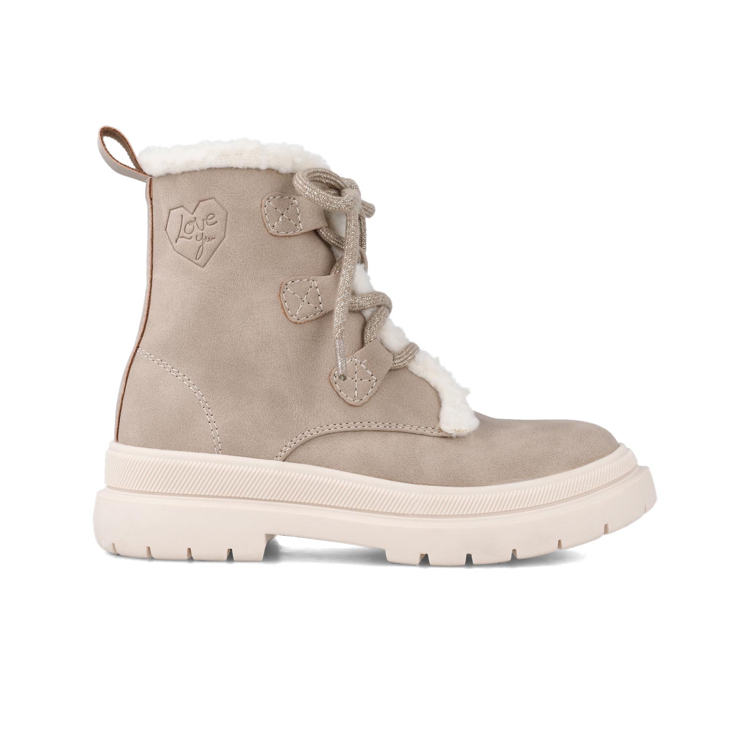 Botín para niña de Garvalin, fabricada en color taupe con materiales de primera calidad. Este botín tiene un diseño muy moderno, siguiendo las tendencias, con suela de gruesa de track y adorno pelo sintético.