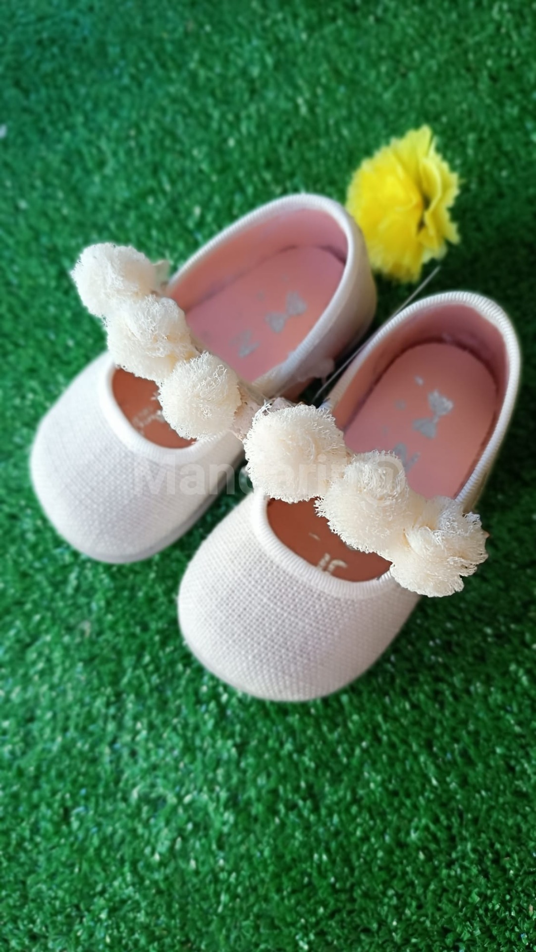Zapato Bebe de Zapy, con detalle pompón en el cierre, fabricado en lino, con suela de goma flexible y antidesliszante.